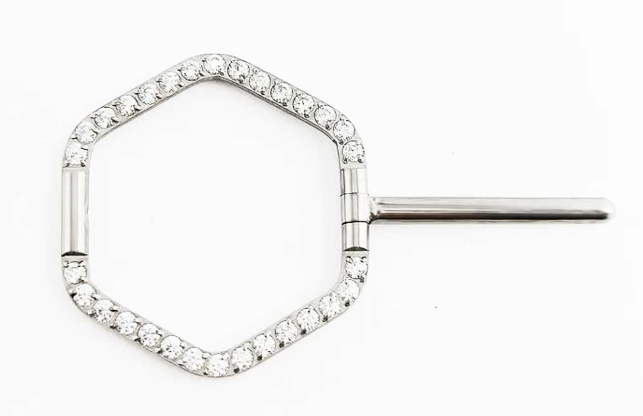 Brustwarzenpiercing Kristallklicker mit Scharnierverschluss. Der Stab wird einfach seitlich aus dem Ring gedrückt, der Stab eingesetzt und danach wieder in den Ring geschoben. Klickverschluss=im Ring ist eine kleine Einkerbung, in die das Stabende einklickt. Kinderleicht und nie wieder verlorene Schraubverschlüsse! Titan G23 High Polish oder mit widerstandsfähiger, abriebfester, farbiger PVD-Beschichtung für dauerhaften Tragekomfort.